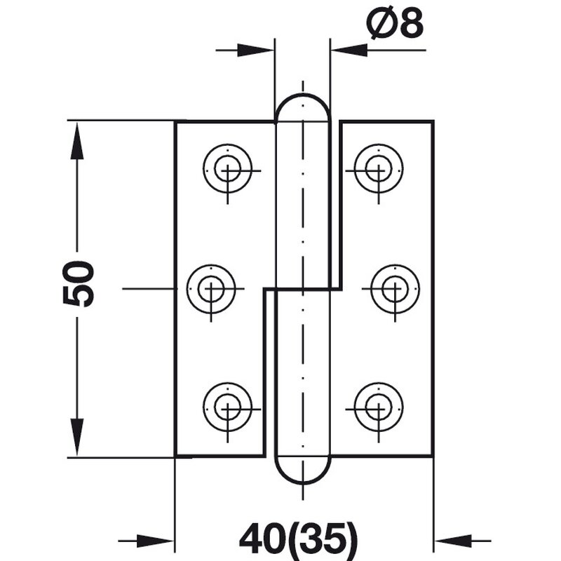 Die Ausführung ist für den Anschlag rechts konzipiert und mit gerader Kröpfung A ausgestattet. Mit den Maßen 50 mm Länge, 40 mm Breite, einer Lappendicke von 1,5 mm und einem Rollendurchmesser von 8 mm eignet sich das Scharnier für leichte bis mittlere Möbeltüren.