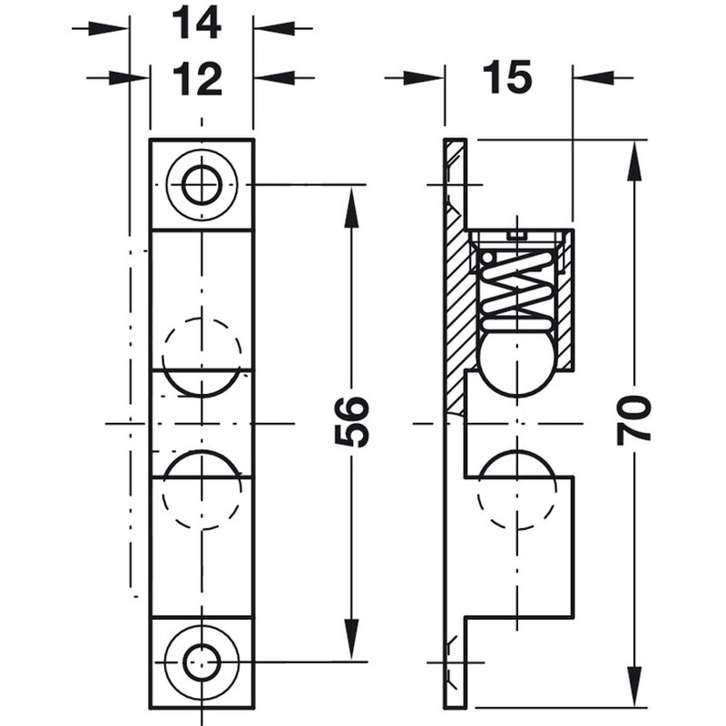 Der Häfele Ideal-Schnäpper Doppel-Kugelschnäpper (Herstellernummer 244.20.017) ist ein langlebiger und robuster Beschlag für Türen und Möbel. Mit einer Gesamtlänge von 70 mm und einer Höhe von 15 mm eignet er sich besonders für größere Türen und Klappen, die eine stabile Schließlösung benötigen.