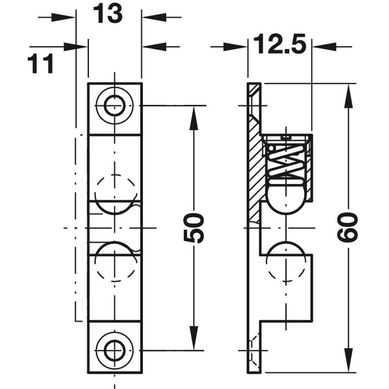 Der Häfele Ideal-Schnäpper Doppel-Kugelschnäpper (Herstellernummer 244.20.616) ist ein stabiler und langlebiger Beschlag für Möbel und Türen. Mit einer Gesamtlänge von 60 mm und einer Höhe von 13 mm ist er besonders für größere Türen und Klappen geeignet, die eine robuste und zuverlässige Schließlösung erfordern.
