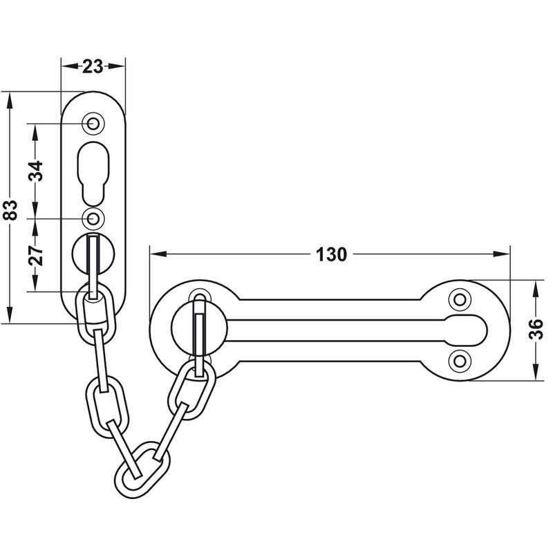 Mit einer Gesamtlänge von 130 mm und einer Breite von 36 mm ist die Türkette kompakt, bietet jedoch durch die 190 mm lange Kette ausreichend Bewegungsfreiheit beim Öffnen der Tür. Das Gewicht von 80 g unterstreicht die solide Ausführung.