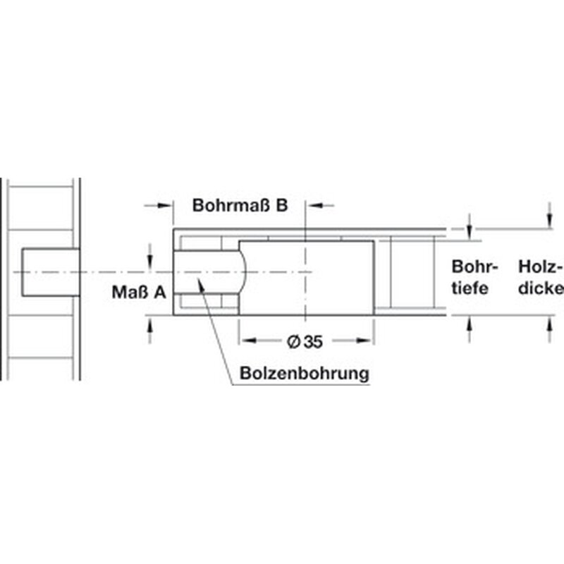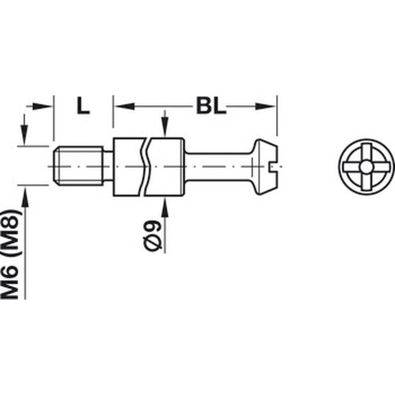Der Bolzen ist mit einem metrischen Gewinde M8 ausgestattet und eignet sich für sichere Verschraubungen. Mit einer Bolzenlänge von 28,5 mm und einer Gewindelänge von 9,5 mm passt er perfekt in Möbelkonstruktionen mit einem Bohrmaß von 35 mm und einer Bolzenbohrung von 9 mm.