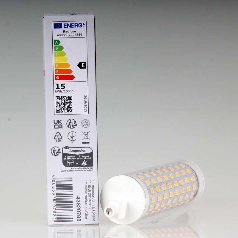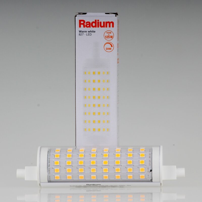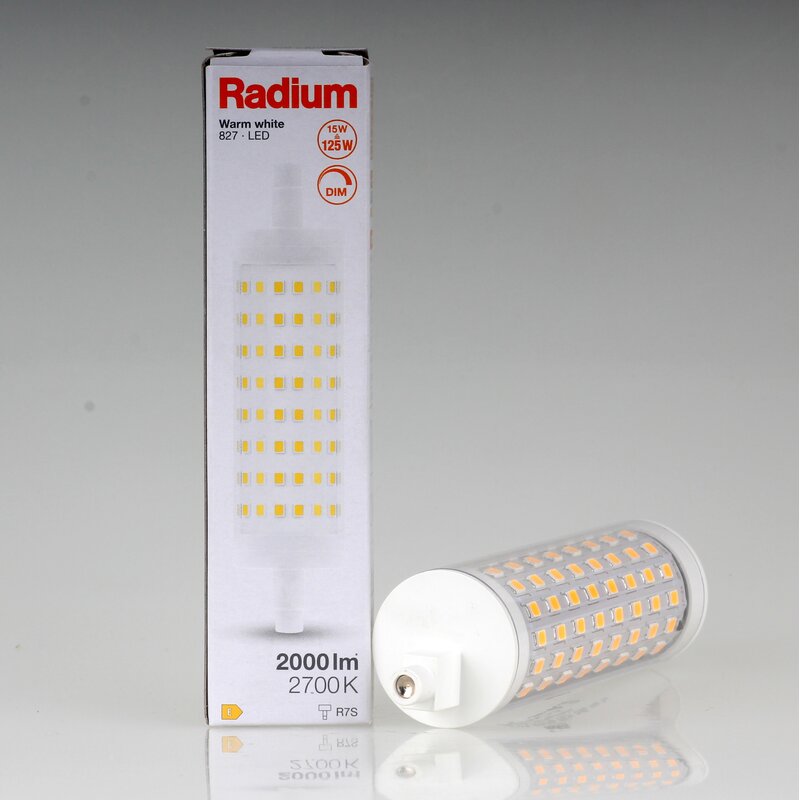Radium R7s LED-Stablampe 118 mm, 15W (entspricht 125W), 2000 Lumen, warmweiß 2700K, dimmbar, langlebig und energieeffizient – erhältlich bei Radio Kölsch Hamburg.